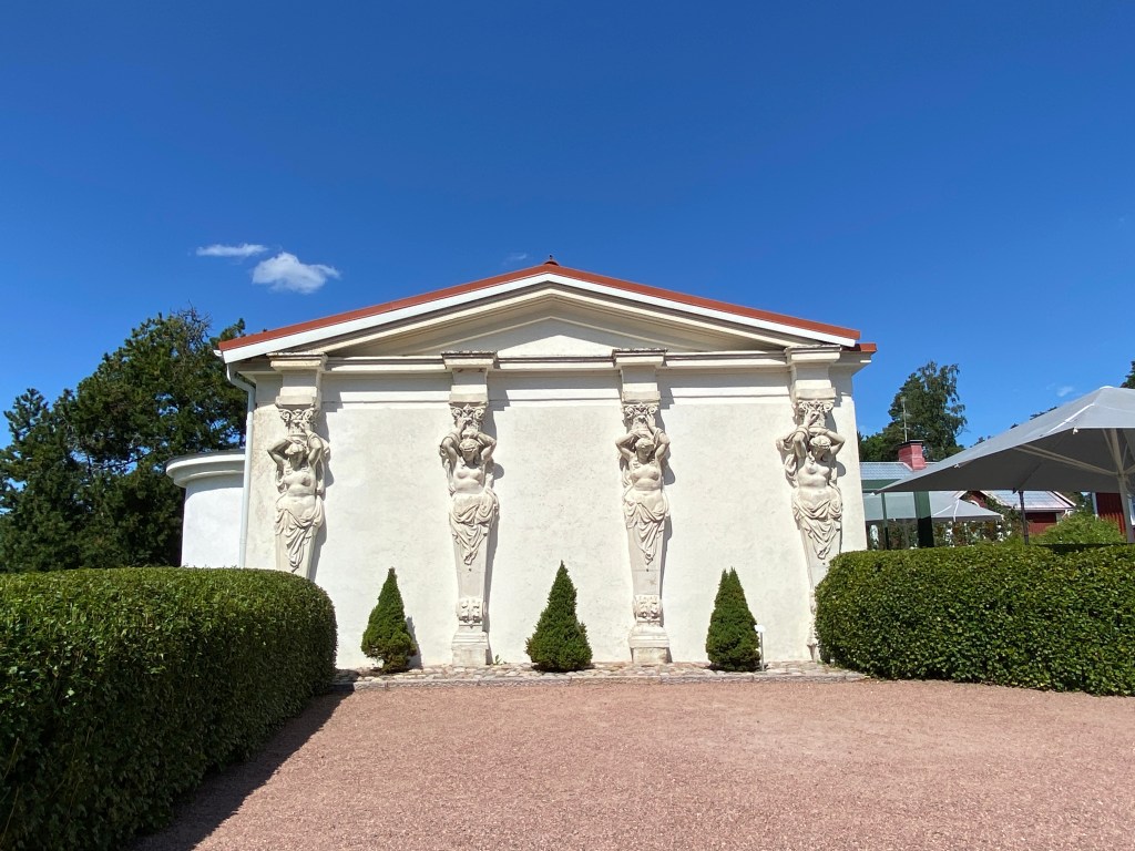 Söderlångvikin kartanon vanhan autotallin ja nykyisen tilapuodin seinää koristavat upeat pilarit eli karyatidit